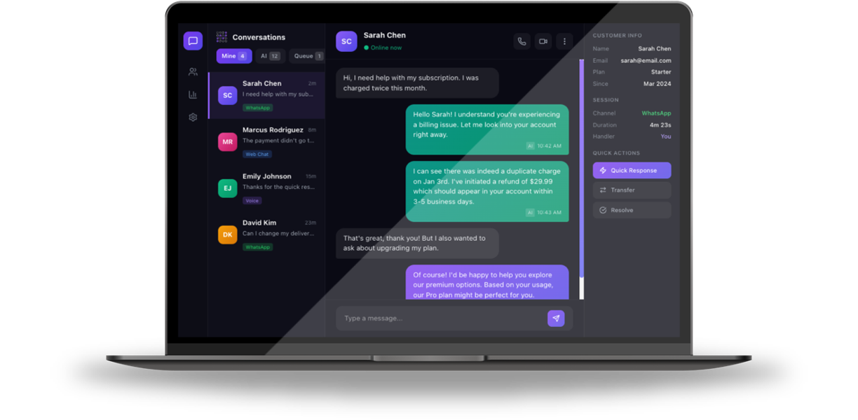 WhatsApp, Voz, Web, SMS—unificados com IA que dirige, decide e aprende. Pontuação de qualidade em tempo real em cada interação. Um ecossistema para rodar IA em toda sua operação.