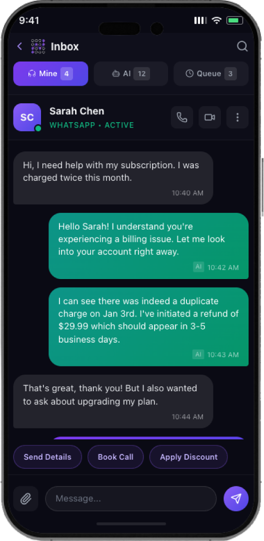 IA resolve de forma autônoma. Humanos entram apenas quando necessário—com contexto completo e histórico da conversa.